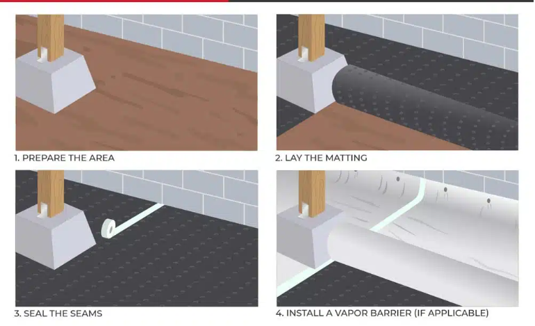 Periodically check the matting for debris, tears, or trapped water, which could reduce its effectiveness. Ensure drainage systems remain clear to allow proper water flow, and address any signs of moisture buildup promptly to maintain a dry crawl space.